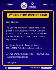 News Home » News 2nd Mid-term Report card 2025-26 Read More 2nd Parent Teacher meeting Academic year 2025-26 Read More 1st Parent Teacher meeting for academic year 2025-26 Read More National Olympiad for Scientific Creativity “Ibda’a” Read More Load More